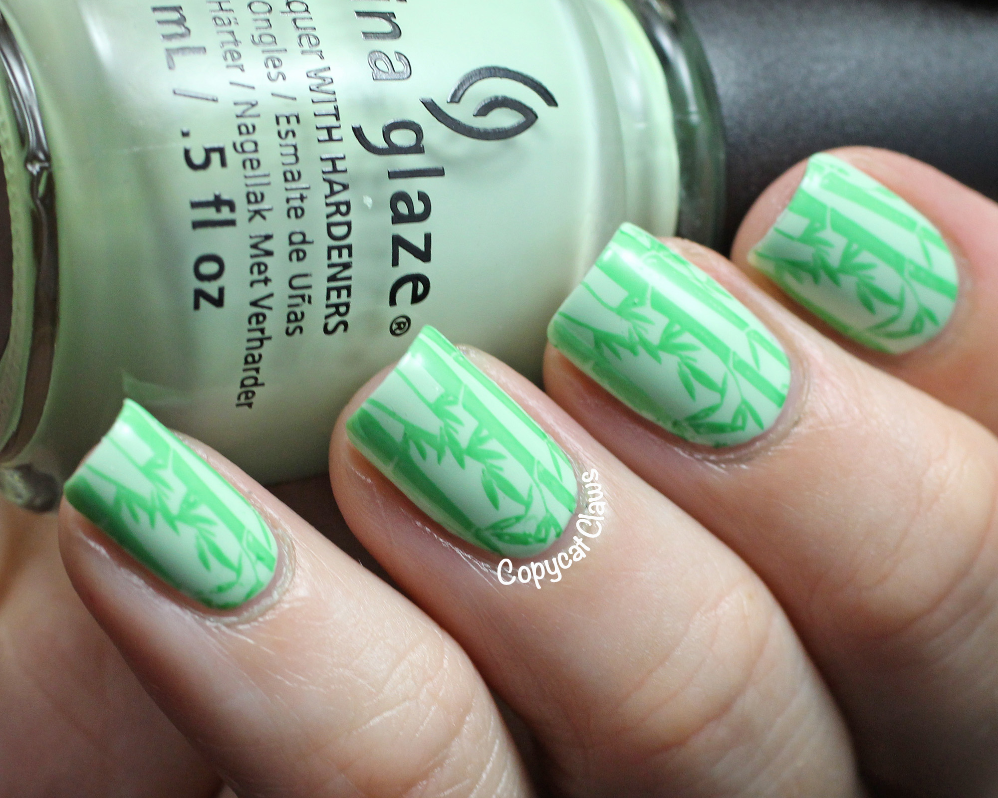 Then using Sally Hansen Insta-Dri I-rush Luck I stamped on a bamboo image from Bundle Monster BM-424.