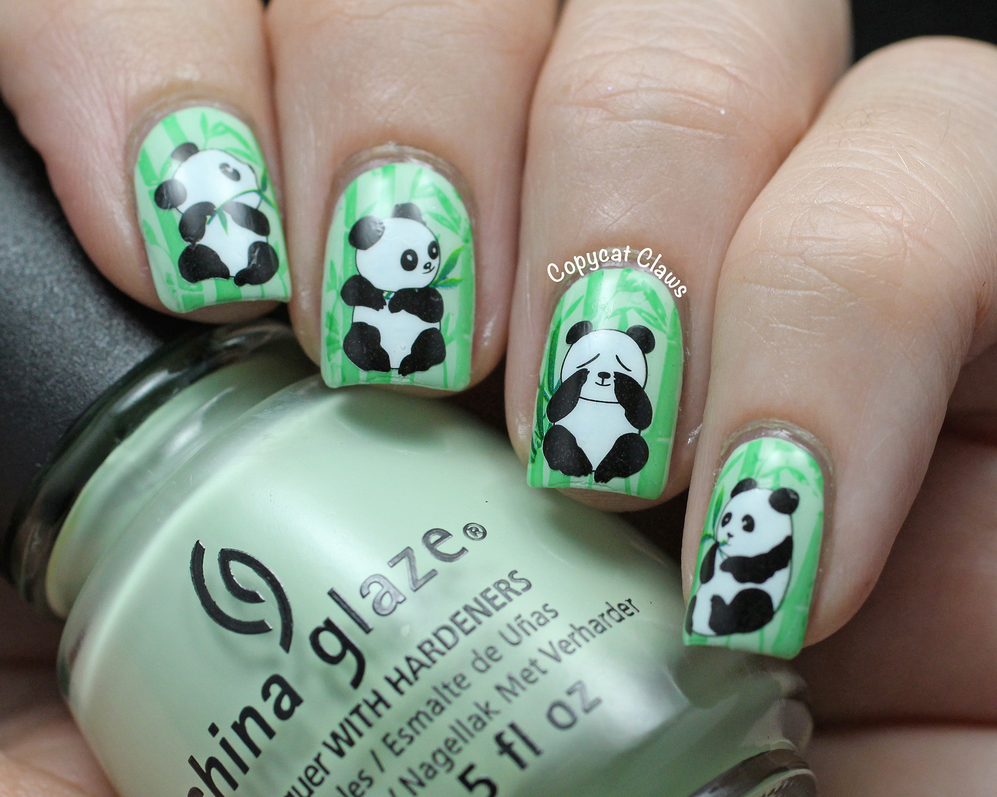 After this was dry, I added the water decals.  Seriously, how cute are these pandas?!  These decals come with enough transfers to do two mani's with a mix of panda and leaves which is nice though it would have been nicer to have an extra panda so you could do all 5 nails twice.  As it was, I skipped putting pandas on my thumbs.