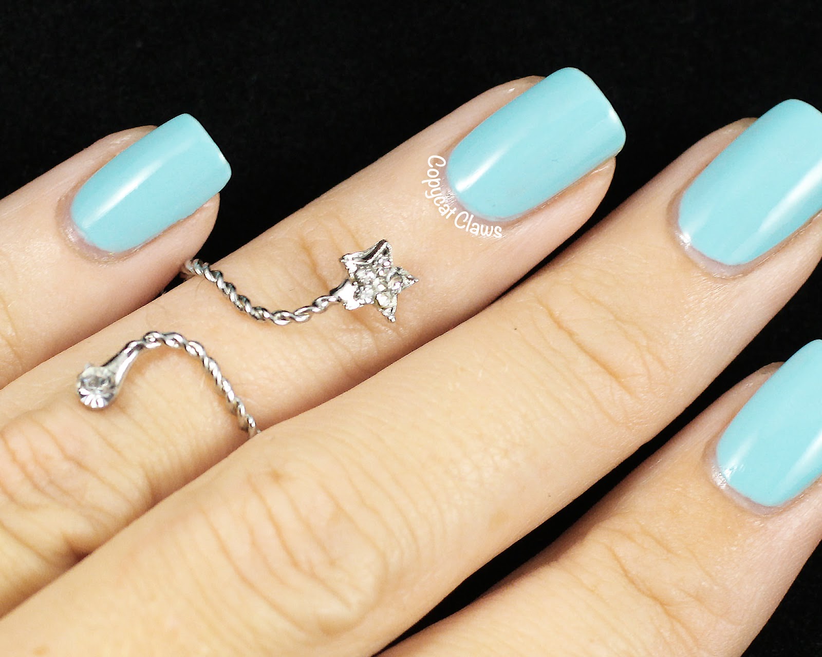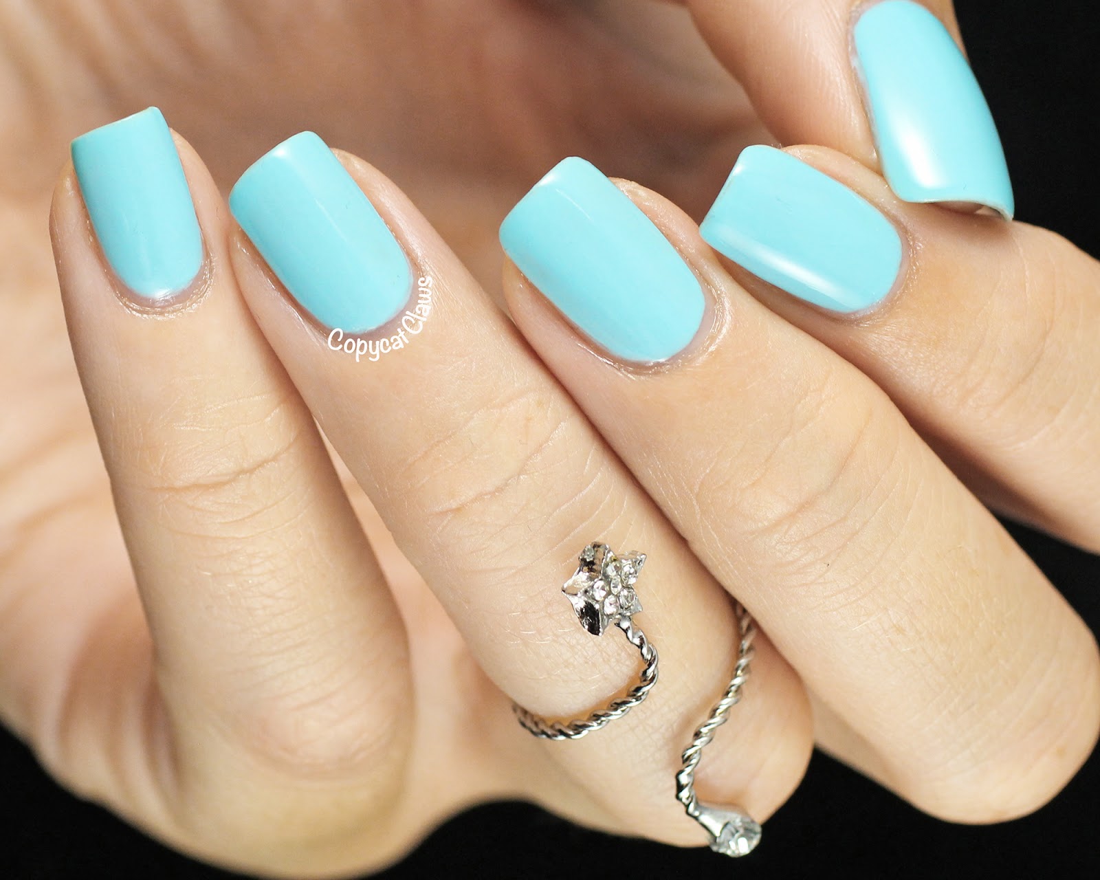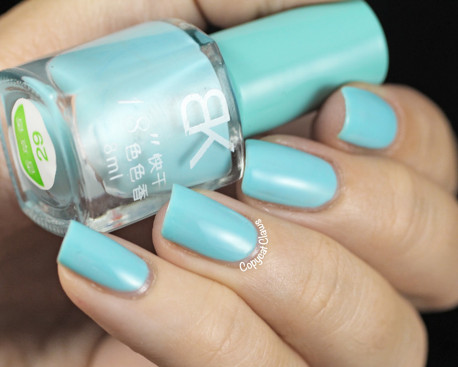 The polish I tried is BK29 (item 4853, colour #29), a beautiful robin's egg blue. I've tried some of Born Pretty Store's shimmer polishes before but never a creme. I actually really liked this one. The bottle is on the small side (8 mL) but it applied smoothly and only took 2 coats to reach full opacity.