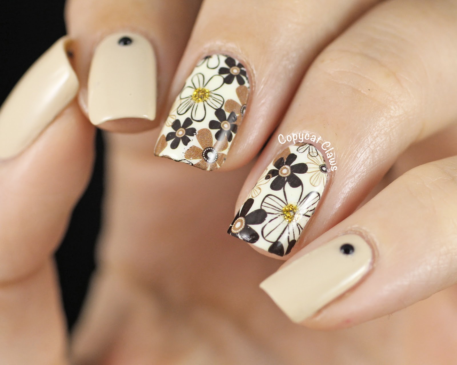 The first decals I used are the retro flower decals (item 7828, style 2102). I placed these on a white base and used 2 coats of OPI You're So Vain-illa with black studs on my other nails. I particularly like the gold flower centres on some of the flowers. Who doesn't love a bit of sparkle?