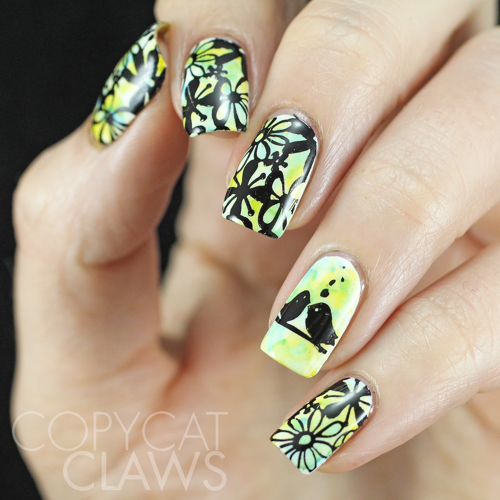 For the stamping I used Mundo de Unas Black and BP-20 for the flowers and BP-58 for the birds. I had decided to order the BP56-60 and L009-020 plates off eBay thinking they might get to me quicker. I don't think they showed up any sooner though they were a bit less expensive but I'm not convinced they stamp as well as the ones I've ordered straight from Born Pretty Store. If anyone else has any thoughts on the eBay BP plates, please let me know if I'm being nutty.