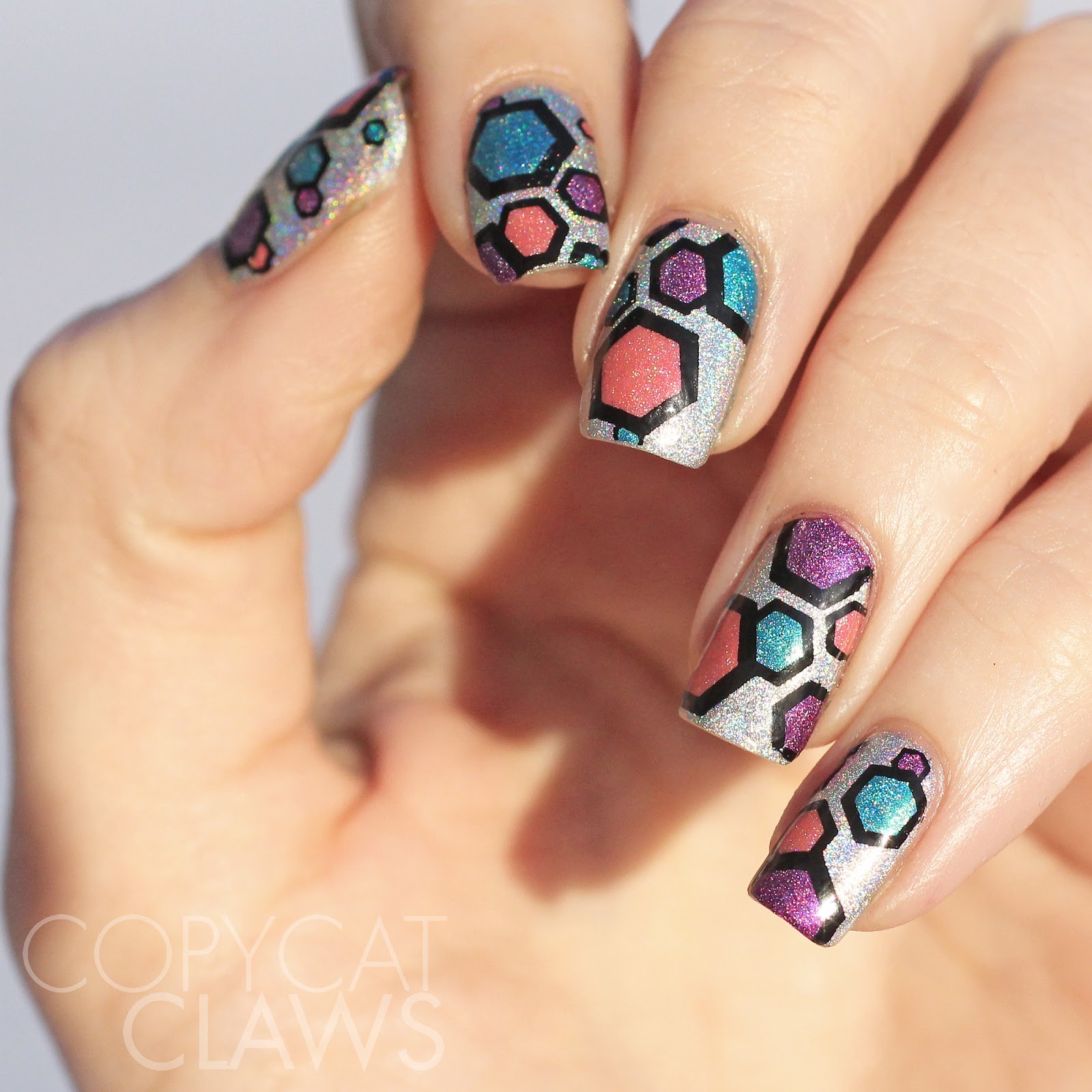 For the stamping decals I used Emily de Molly Setting Sun (pink) and Mind Powers (blue) and A England Crown of Thistles (purple) to fill in the hexagons. They took quite awhile to make but I wore them for days so it was worth it.