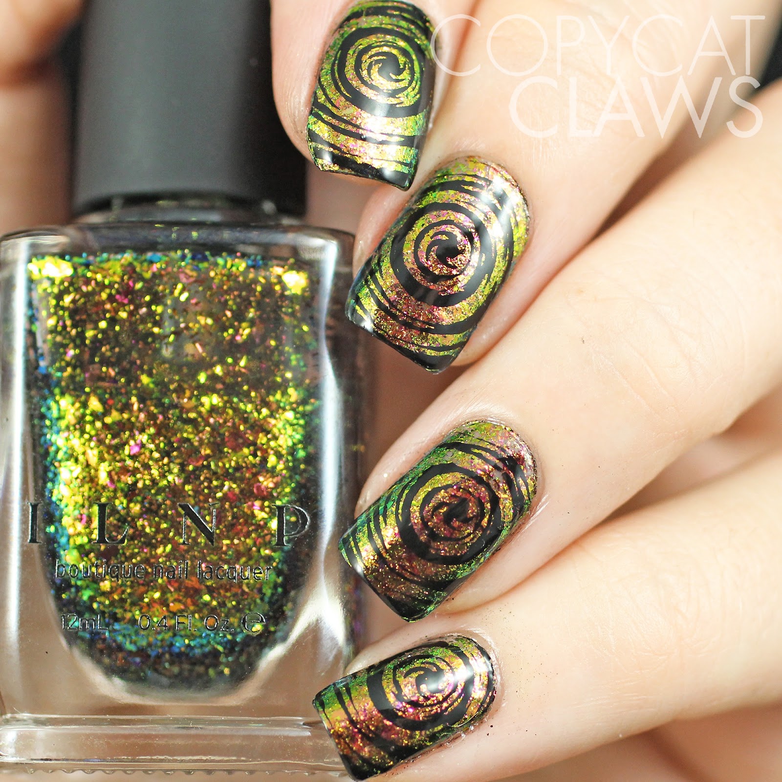 Hey there! As I mentioned on Sunday, I've fallen back in love with flakie polishes after neglecting them for awhile. For these ones I wore a flakie on it's own (without undies) and stamped over it. There was something about this stamping image with the multi-chrome nature of the flakie that reminded me of Halloween. It's a bit creepy eh?