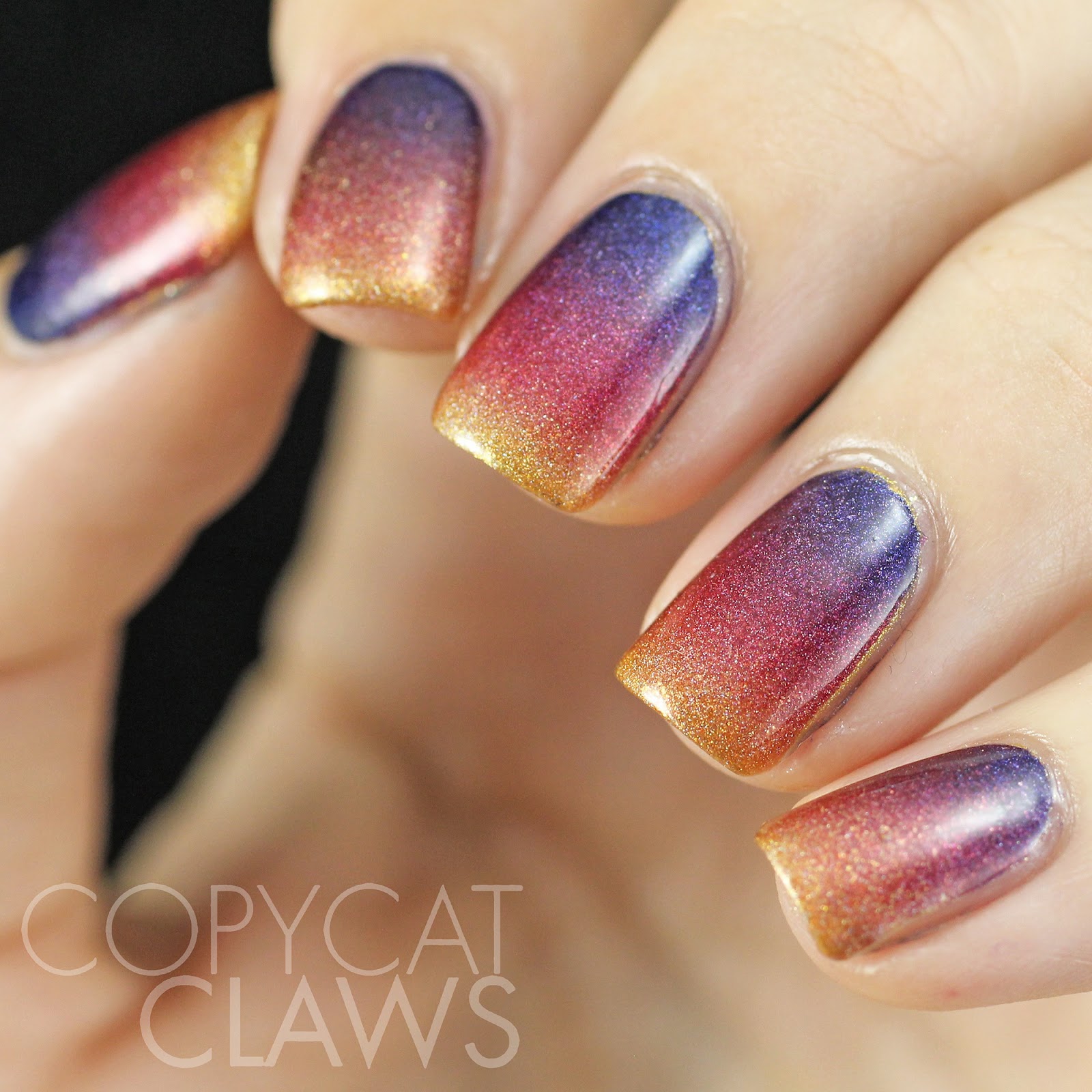 Hey there! I have a short post today to share a gradient I wore a few weeks ago. I love gradients but don't usually do them with holo polishes so I thought it looked pretty neat...which is a good thing because I had to keep in on my nails for a few days when I had overseas company last month.