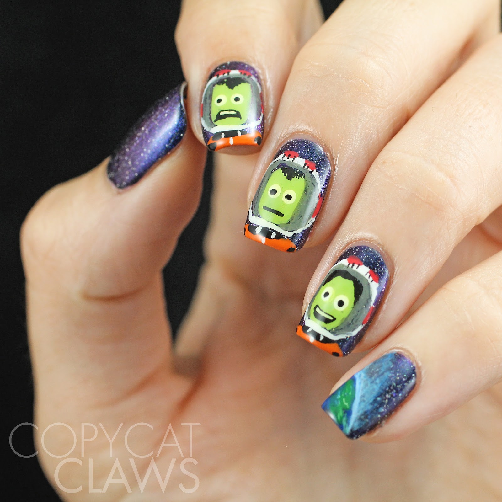 Hey there! It’s time for another 40 Great Nail Art Ideas theme week. This week we’ve done Geeks. I fully embrace geek culture but there’s so many things nowadays that are “cool geeky” that I was unsure of what type of geeky inspiration I wanted to use this week. Science geek? Gamer geek? Why not both?! I recently heard about this video game called Kerbal Space Program. I can’t say I know much about it except that it sounds really hard and really geeky…in the best way possible, of course!