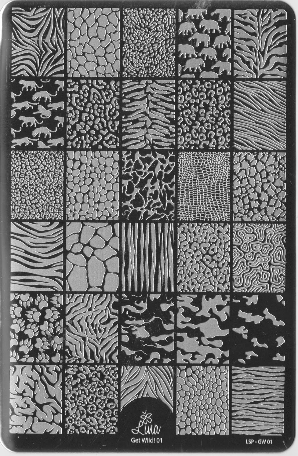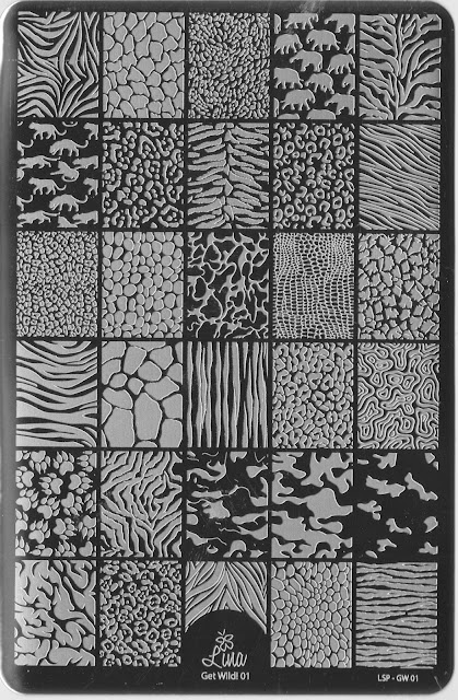 Lina has also come up with an animal print plate that's a must-have to anyone who has just started collecting plates.  I've been collecting for years but I still specifically requested this plate so I could have all the animals in one place.  And there's more than just animal print.  There's also a few silhouettes and a layered camo image that I just had to take a stab at.