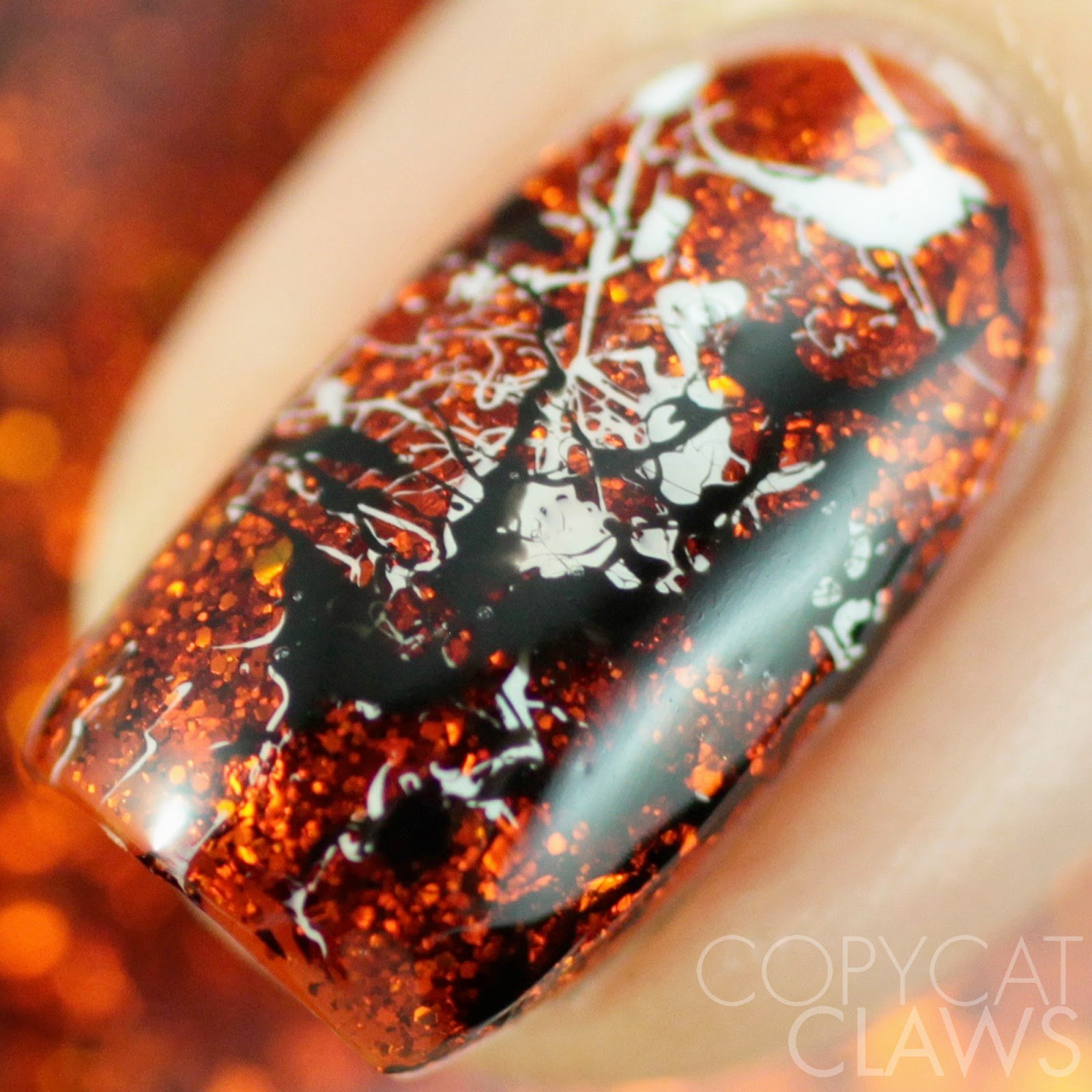 The polish is Fair Maiden's Mindfreak, September's PPU offering. Holy, it's stunning! The orange flakies just glow! I did 3 coats of it before the splatter hell began.