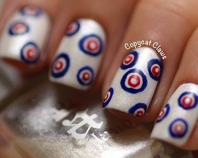 To try to make something special for the start of curling, I tried to imitate the "house" (the circles you throw to). I started with 2 coats of white polish followed with a coat of A England Morgan Le Fay to give it that icy shimmer. I think added concentric circles with China Glaze Man Hunt and China Glaze With Love and white.
