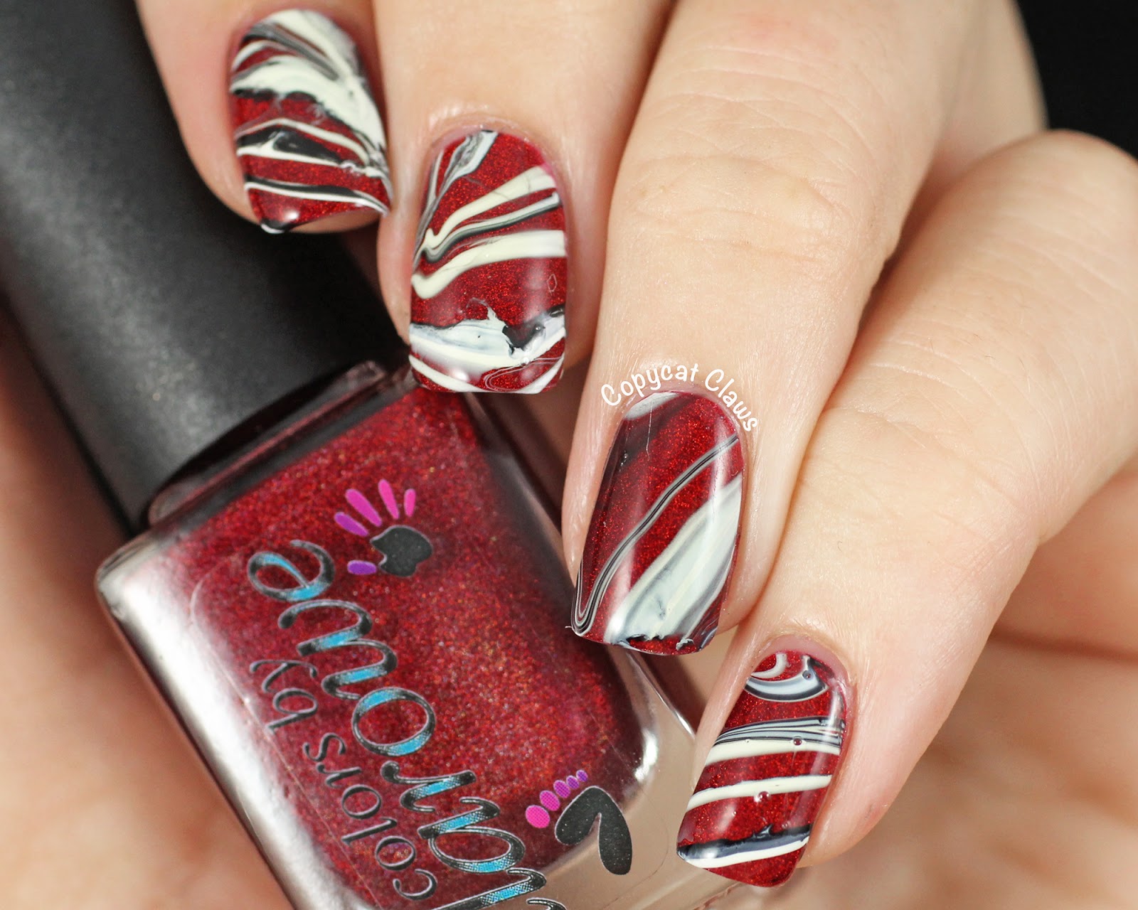 Day 1's prompt is Red Nails. I can do this right? So I went with an AWESOME red, Colors by Llarowe The Mighty Red Baron, and did a messy water marble on top of it.